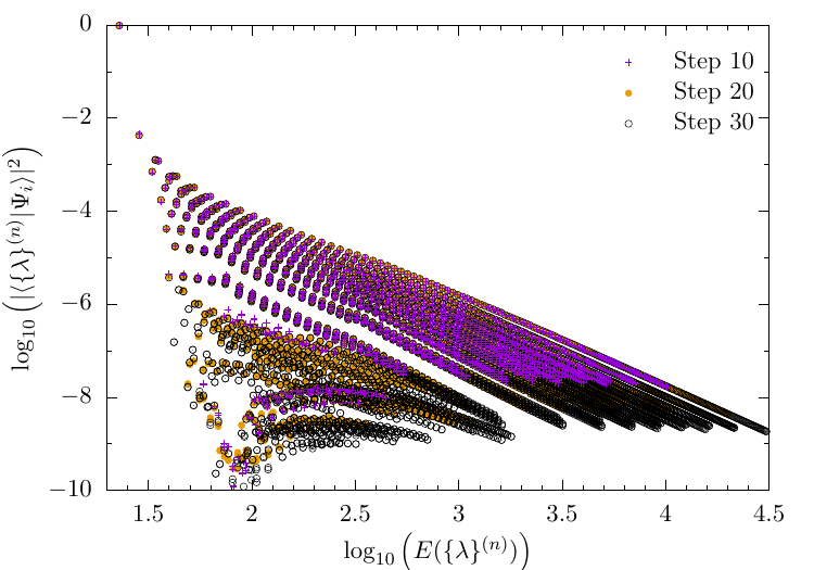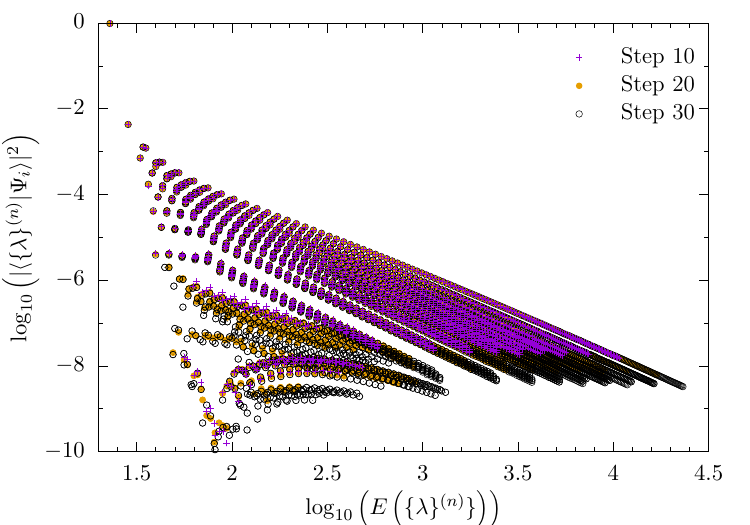 We write the initial state in the basis of the eigenstates of $H(c_f)$, denoted as $\left\{ |\{\lambda\}^{(n)}_N\rangle \right\}, n = 0, 1, ...$