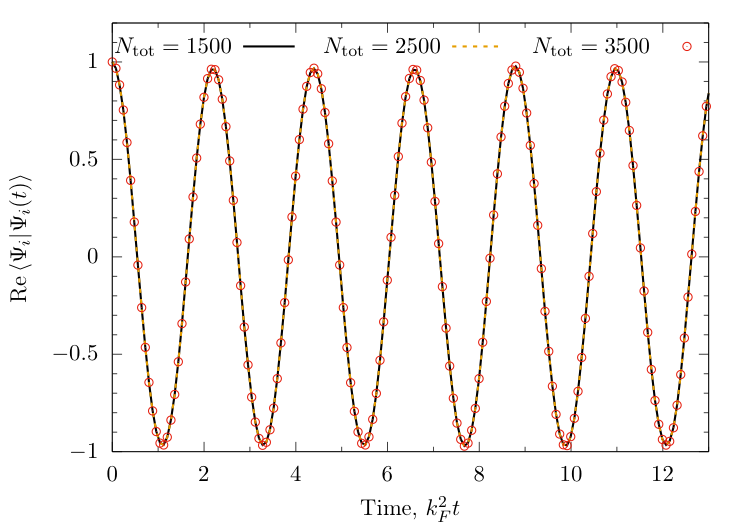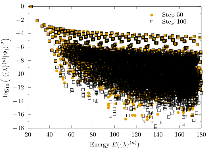 $ \langle \Psi_i |\Psi_i(t)\rangle \approx \sum_{n=0}^{N_{\text{tot}}} e^{-\mathrm{i}E(\{\lambda\}^{(n)}t} \left\vert \langle \{\lambda\}^{(n)} | \Psi_i \rangle \right\vert^2 $